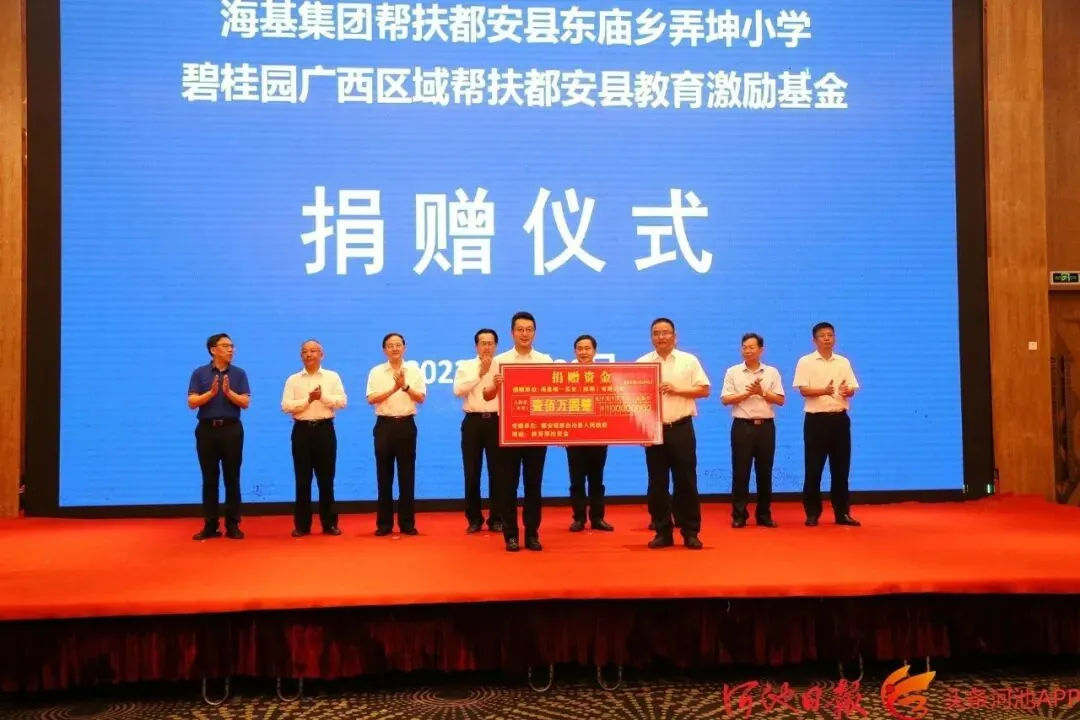 刘棕会、邝兵、黄智宇、秦春成还出席碧桂园集团、海基维一实业(深圳)有限公司教育帮扶捐赠活动。活动中,海基维一实业(深圳)有限公司为都安弄坤小学捐赠100万元,碧桂园集团为都安永吉村、加文村、平浪村、元力村捐赠30万元教育帮扶资金。