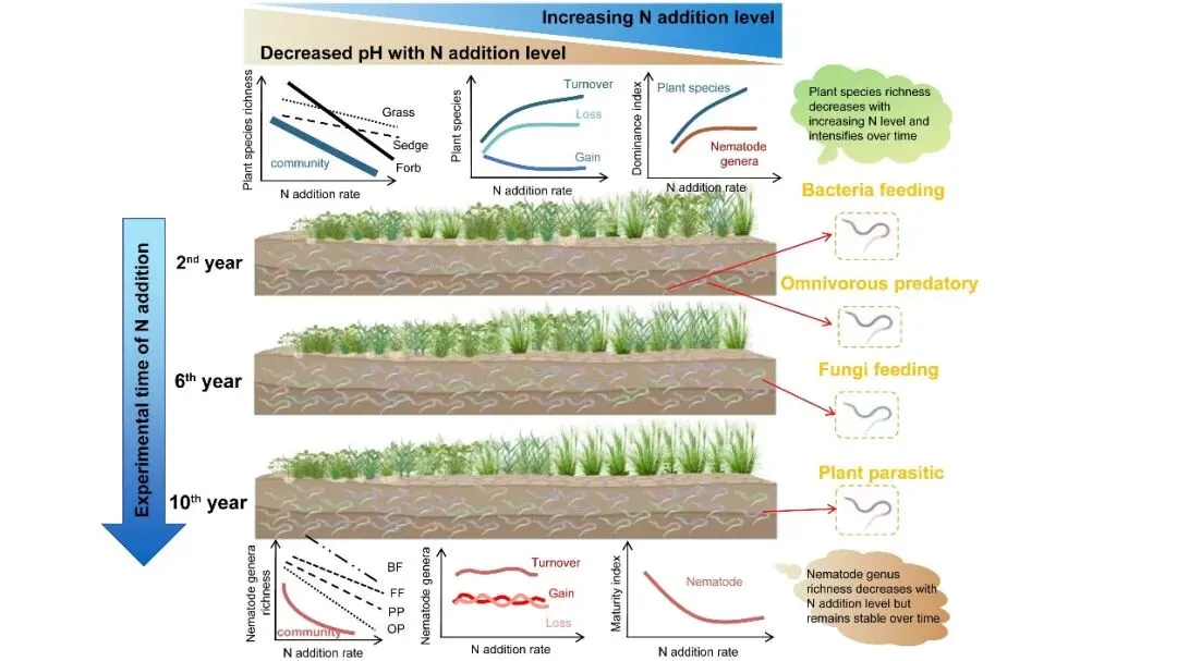 研究发现,随着氮添加水平和实验年限的增加,植物物种多样性持续下降且呈明显的时间累积效应,这种下降主要由物种快速丧失驱动,尤以杂类草最为敏感。相较之下,土壤线虫多样性对氮富集表现出阈值型响应特征:在较低氮添加水平下多样性迅速下降,但在更高氮水平下趋于稳定,且该响应模式并未随实验年限显著加剧。进一步分析表明,植物群落多样性下降主要源于氮富集强化了优势种的竞争排他作用,导致群落优势度持续升高;而线虫群落则通过不同属和不同营养功能类群之间的补偿性替代维持了整体多样性的相对稳定,表现出更强的结构重组能力和时间尺度上的韧性。不同营养级线虫类群对氮富集的敏感性存在显著差异,其中食细菌线虫和捕食–杂食性线虫受负面影响最为明显。