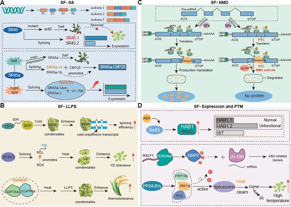 论文详细阐述了植物可变剪接(Alternative splicing,AS)在高温、低温、干旱及盐胁迫响应中的特异性功能,并分别梳理了其在不同胁迫条件下对植物生物钟与开花过程的调控机制及作用关系。另外,文中还探讨了植物胁迫记忆与AS的关联,以及剪接因子的分类、功能及其介导的抗逆基因调控机制,填补了剪接因子在作物抗逆网络中进行系统性整合的空白。