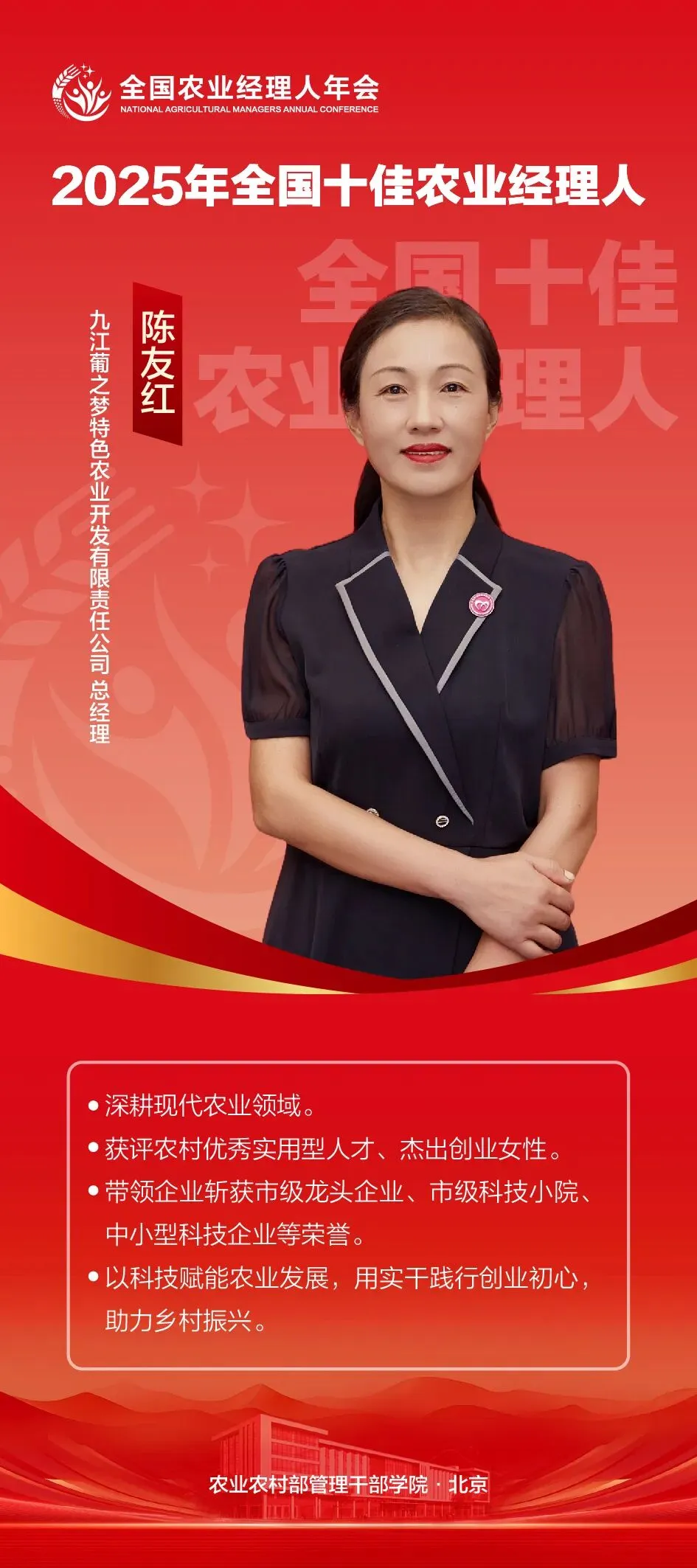 陈友红主导多项核心举措:技术创新上,研发“葡萄-萝卜”生态循环种植模式,将萝卜降解为天然有机肥,搭配避雨棚、物联网等设施,节水节肥且降低人工成本,葡萄糖度达18-22°;产学研合作上,联动高校共建科技小院,承担省级科研课题,开展技术培训30场次,受益农户超500人次;产业融合上,打造“种植-加工-旅游”全产业链,年接待游客超2万人次;联农带农方面,推行“订单式帮扶”,免费提供种苗与技术,带动200余户农户增收,常年雇佣40名本地村民就业。
