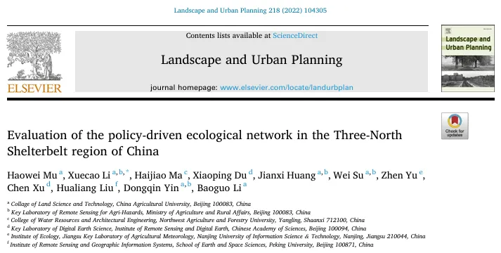 SCI期刊:Landscape and Urban Planning英文题目: Evaluation of the policy-driven ecological network in the Three-North Shelterbelt region of China中文题目: 中国三北防护林地区政策驱动生态网络的评估发表时间: 2021年11月14日文章链接: https://doi.org/10.1016/j.landurbplan.2021.104305