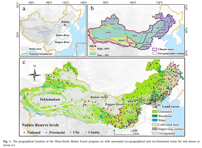 研究区覆盖中国北方13个省份的551个县,占国土面积的42.4%。区内包括4个温度带和4个气候带,分布着486个自然保护区,是中国生态屏障的重要组成部分。