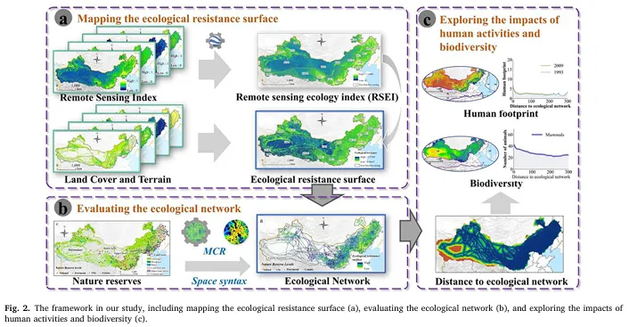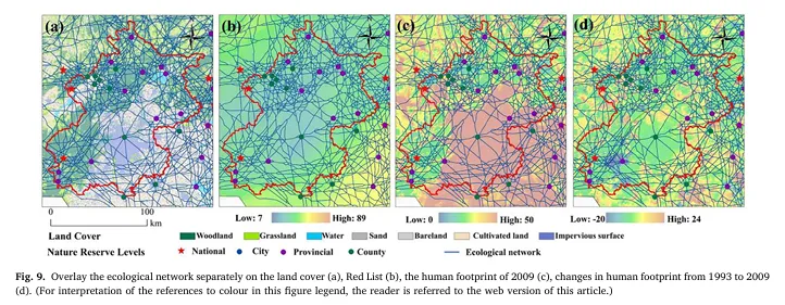 分析人类足迹与物种分布与生态网络的关系。