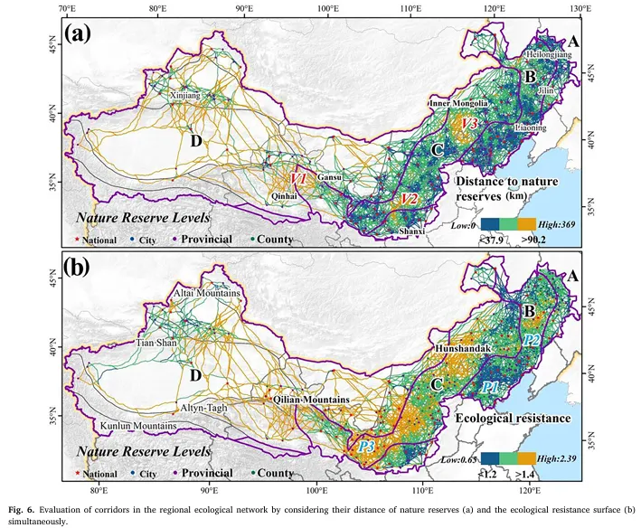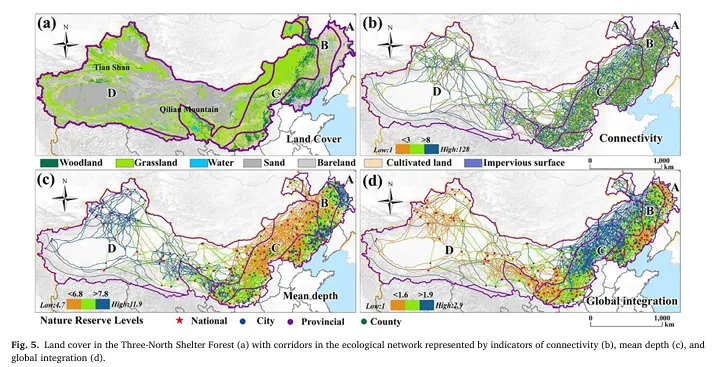 本研究首次在三北防护林区域构建政策驱动的生态网络,结合遥感技术与空间句法分析,评估生态廊道的连通性与脆弱性,为生态保护与国土空间规划提供了科学依据,也为三北防护林三期工程(2021–2050)的实施提供了重要参考。