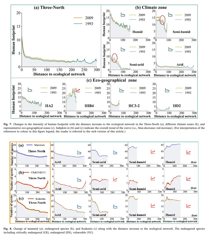 人类足迹和物种数量均随距离生态网络越远而减少;