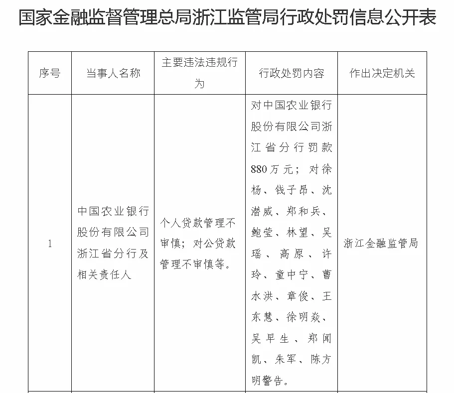 更为引人关注的是,根据2026年1月22日的公开报道,农行浙江省分行本级因“个人贷款管理不审慎”等违法违规事实,被国家金融监督管理总局处以880万元的罚款。这笔高额罚单直接指向了省分行层面的内部管理问题。