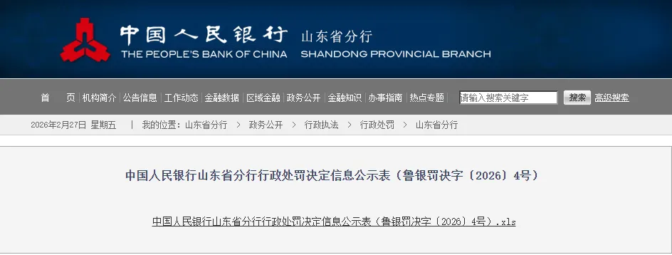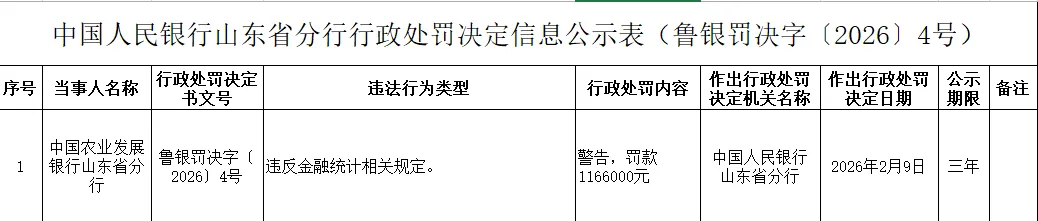 近日,中国人民银行山东省分行行政处罚决定信息公示表(鲁银罚决字〔2026〕4号)显示,中国农业发展银行山东省分行违反金融统计相关规定,受到警告,并被罚款116.6万元。
