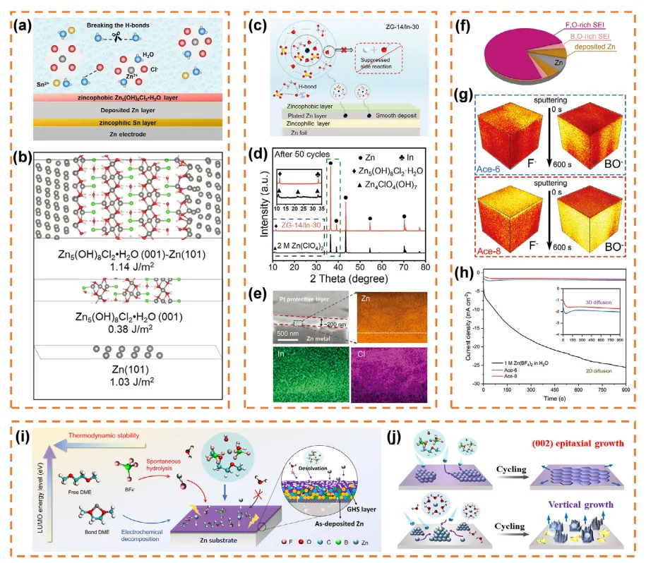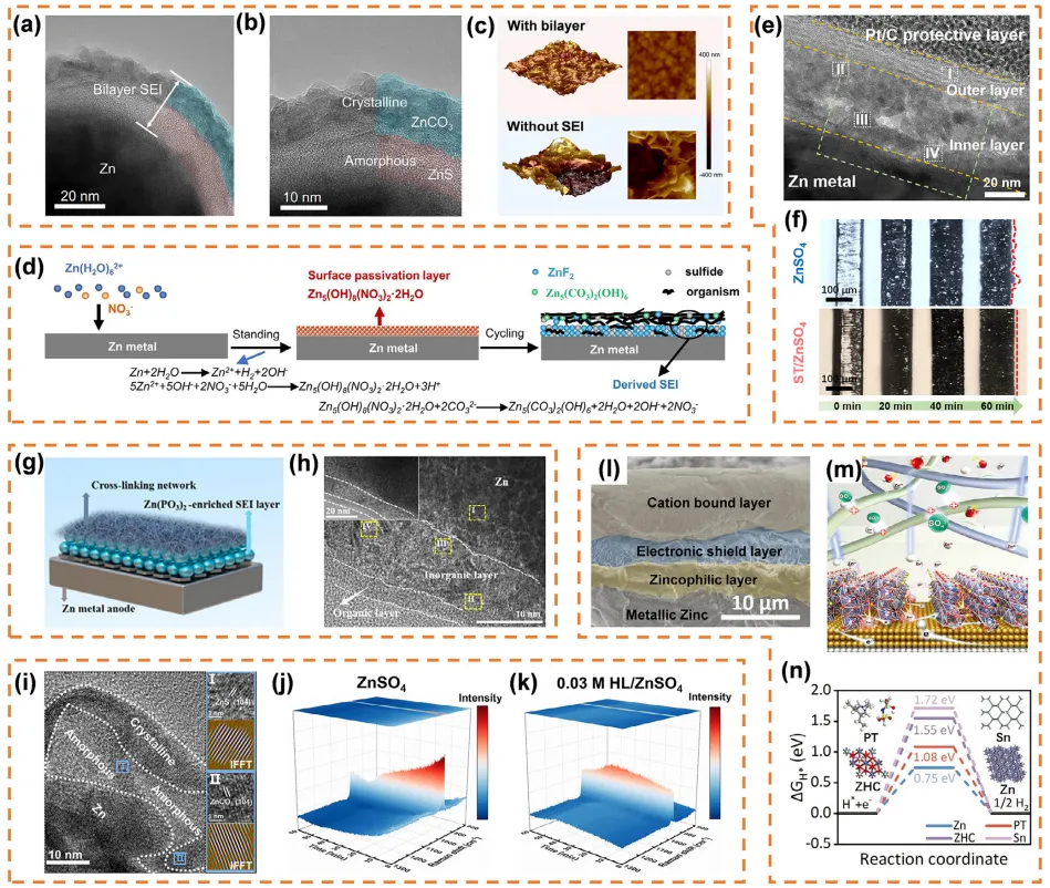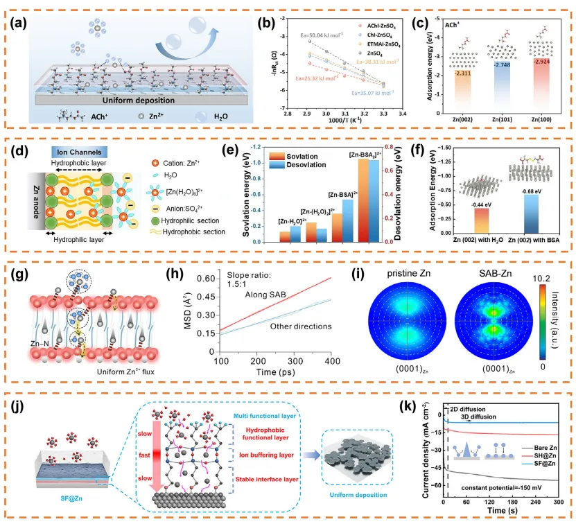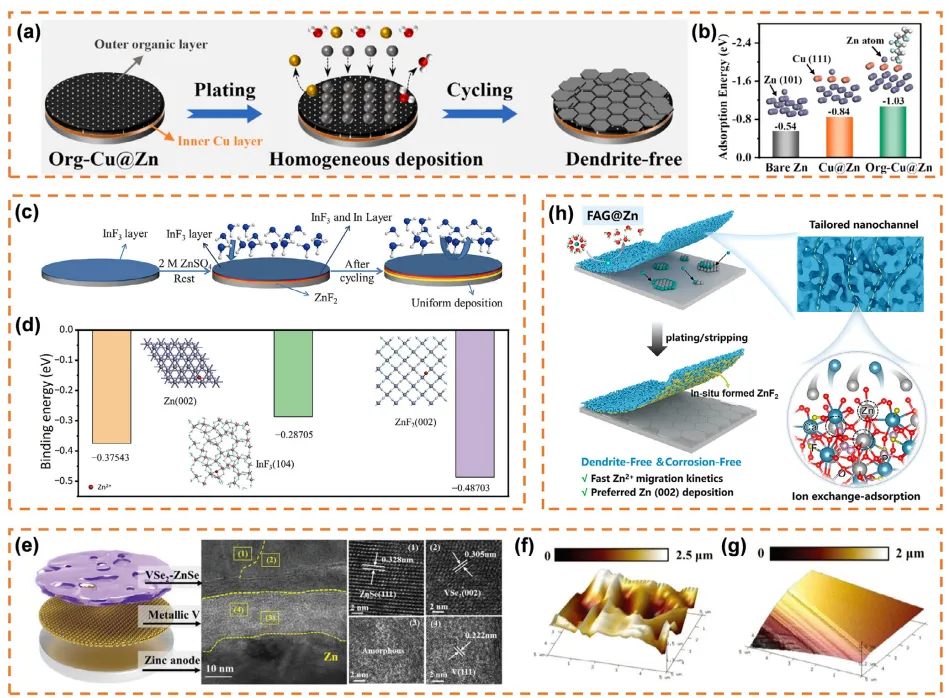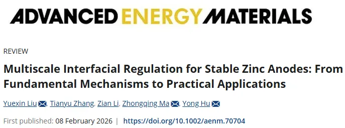 水系锌离子电池(AZIBs)因其本征安全性和低成本,成为大规模储能的有前景候选者。然而,其商业化却受到失控的枝晶生长和寄生副反应的阻碍。2026年2月8日,浙江农业大学胡勇、马中青、刘月鑫在国际知名期刊Advanced Energy Materials发表题为《Multiscale Interfacial Regulation for Stable Zinc Anodes:From Fundamental Mechanisms to Practical Applications》的综述论文,刘月鑫为论文第一作者,胡勇、马中青、刘月鑫为论文共同通讯作者。多尺度界面调控最近作为一种变革性策略出现,以应对这些挑战。该方法通过构建多层结构和优化界面耦合,克服了单一界面调制的局限性,从而为负极提供有效保护。为了促进锌的均匀沉积并抑制副反应,本综述全面总结了跨越多物理场优化、锌沉积取向和电解质溶剂化结构优化的多尺度策略。作者系统地介绍了将这些多尺度策略应用于锌箔、锌粉和宿主基负极,以及隔膜和水凝胶电解质的最新进展,重点介绍了它们的设计原则、底层机制和特定场景的适用性。此外,该综述还阐明了该技术如何通过功能互补的多层、Janus或梯度界面,实现离子传输、沉积行为和界面环境的协同优化,从而系统性地缓解锌负极失效。最后,该综述讨论了未来的研究方向和挑战,强调深刻的基础机理理解与合理设计相结合,对于释放下一代AZIBs的全部潜力至关重要。开发安全高效的储能系统是克服太阳能、风能和潮汐能等可再生能源固有的间歇性和地理限制的一项有前景的策略。在电化学储能领域,锂离子电池(LIBs)凭借其高能量密度、宽工作电压和长循环寿命占据了约89%的市场份额。然而,锂资源的稀缺性和电解质的易燃性限制了其更广泛的应用。目前,许多对LIBs的补充应用仍然依赖于更经济、更安全的铅酸电池(LABs)。然而,LABs的能量密度低、循环寿命短和充电时间长等缺点严重限制了其可行性。因此,迫切需要开发经济、环境友好且高性能的储能器件,以更好地补充LIBs。水系锌离子电池(AZIBs)因其高能量密度、优异的安全性能、低成本和最低的环境要求而在学术研究中引起了广泛关注。如图1b所示,传统的AZIBs由正极、锌金属负极、隔膜和水系电解质组成,其中Zn²⁺离子在正极和负极之间来回穿梭,以实现能量转换和存储。与有机电解质相比,水系电解质具有安全性更高、成本更低和离子传输动力学更快的优点。同时,这种电解质的弱酸性对锌金属负极的腐蚀性比强碱性电解质要小,减少了析氢和钝化等副反应。AZIBs的正极材料包括锰基氧化物、钒基氧化物、导电聚合物和普鲁士蓝类似物等类别。这些材料通常通过各种特定结构实现锌离子嵌入化学反应。然而,由于热力学失配、动力学滞后和不均匀的界面电场,正极材料面临着结构坍塌、活性成分溶解和副产物积累等问题。研究人员已通过客体离子预嵌入、缺陷工程、导电网络构建和三维结构设计等方法极大地改善了正极材料的电化学性能。用于锌电池的负极材料仍主要为锌金属,尽管也已开发出无锌或锌宿主负极,如碳基材料、过渡金属硫化物和有机聚合物。这是因为锌金属具有高的理论比容量(5855 mAh cm⁻³和820 mAh g⁻¹)、低的电化学平衡电位(-0.76 V vs. SHE)和成本效益(22.5元 kg⁻¹)。然而,在水溶液中使用的锌金属负极也面临一些挑战,这些挑战阻碍了Zn²⁺离子沉积/剥离的可逆性(图1c)。例如,由于不均匀的电场分布和受限的离子扩散,Zn²⁺离子倾向于在负极表面不均匀地沉积,导致枝晶形成。具有高杨氏模量的锌枝晶最终会刺穿隔膜并导致电池短路。同时,这种脆性的锌枝晶容易断裂并形成死锌,导致电池容量损失和内阻增加。此外,在锌金属负极上发生的析氢反应(HER)不仅增加了电池的内部压力,还由于消耗氢离子而导致局部pH值升高。升高的pH值促进了金属锌与水的反应,导致形成氧化锌/氢氧化锌钝化层,这进一步消耗了活性锌。不幸的是,AZIBs中通常不存在固体电解质界面(SEI),这使得抑制水诱导的副反应和锌金属负极上的枝晶生长尤为具有挑战性。最近,研究人员提出了各种策略来调控Zn²⁺离子在锌金属负极表面的沉积行为,相关出版物的数量每年均呈快速上升趋势(图1d)。改进方法包括构建人工SEI界面、锌负极合金化、构建三维(3D)集流体、多功能隔膜设计、电解质改性和采用水凝胶电解质等。这些方法遵循若干调整原则:(1) 降低水合锌离子([Zn(H₂O)₆]²⁺)的去溶剂化能垒以最小化能量损失;(2) 优化电场分布以实现锌离子的均匀传输;(3) 防止活性水分子直接接触锌负极,从而抑制析氢反应并减少副产物的形成;(4) 引导锌金属优先沿低能(002)晶面生长以抑制枝晶形成;(5) 优化锌离子的迁移路径以缓解浓度极化。在这些改进策略中,界面工程因其强大的经济和实用价值而被广泛应用于AZIBs。具体而言,界面工程通过在锌负极、隔膜或水凝胶电解质表面构建具有特定功能的界面,有效地调控锌离子沉积行为和水分子相互作用。这些策略可以显著抑制锌枝晶的生长并减少锌负极上副反应的发生,是提高锌金属负极稳定性的有效途径。构建界面层的方法有多种,包括典型的物理涂覆、原位转化和电化学沉积等。然而,界面材料的选择应充分考虑其本征特性和对目标技术的适应性,包括但不限于电化学稳定性、机械强度和界面相容性等关键参数,以确保材料技术体系的协同优化。此外,现有研究表明,单一的界面