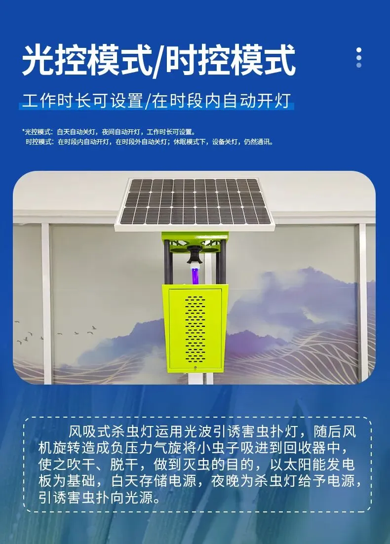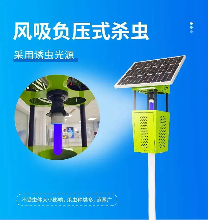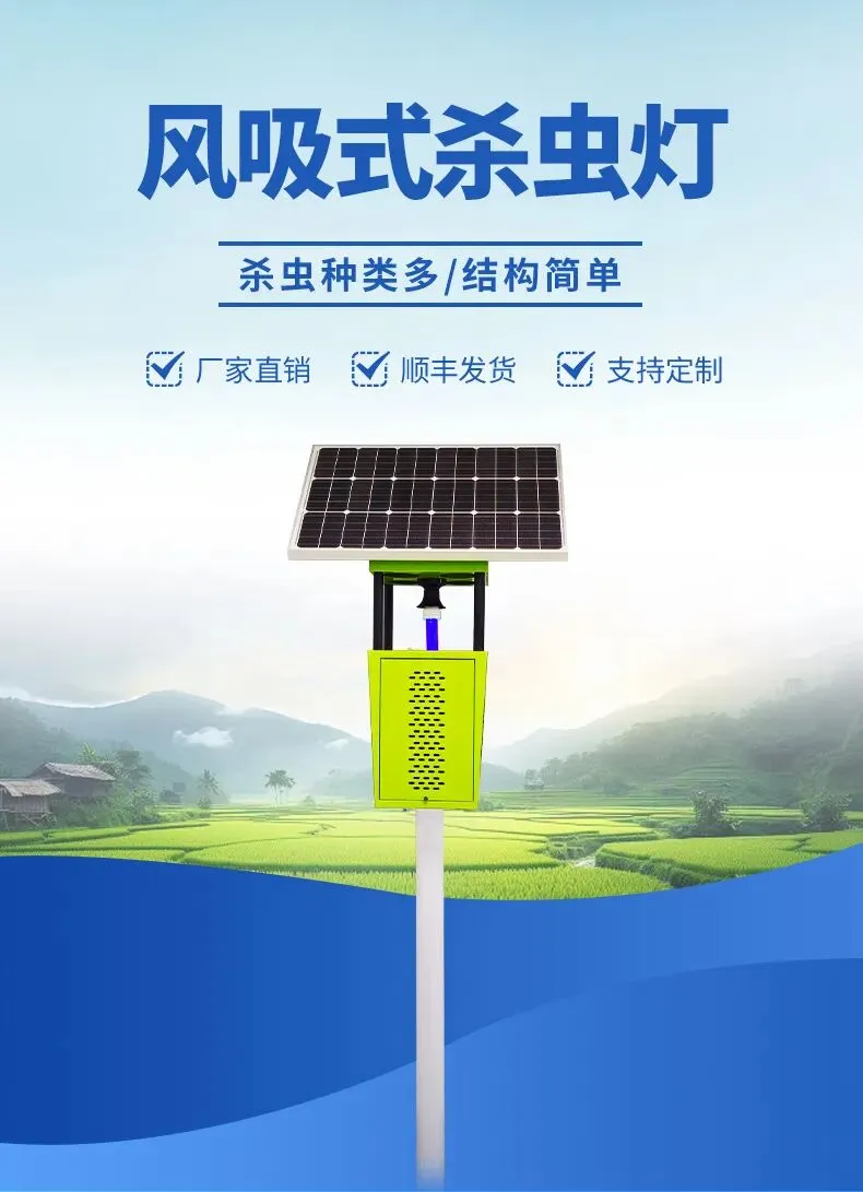 风吸式太阳能杀虫灯是生态农业的物理防虫设备,集太阳能供电、光波诱虫、负压风吸技术于一体,实现无农药、高效率灭虫。