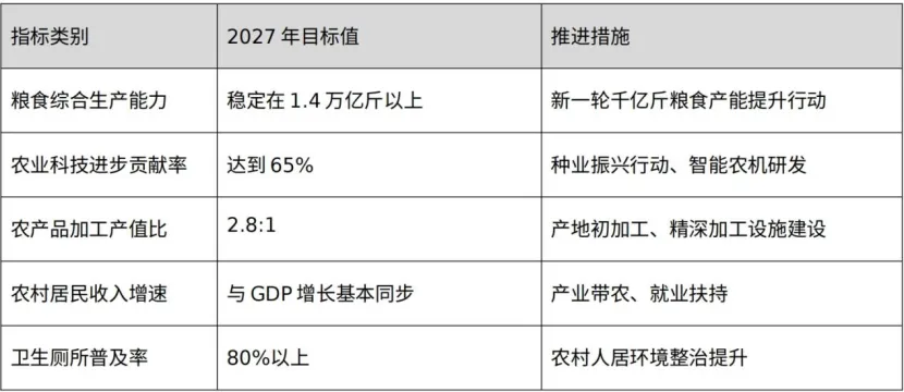 量化预期:农业科技进步贡献率将超过70%,主要农作物耕种收综合机械化率达 85%以上,城乡居民收入比缩小至 2.0 以内。