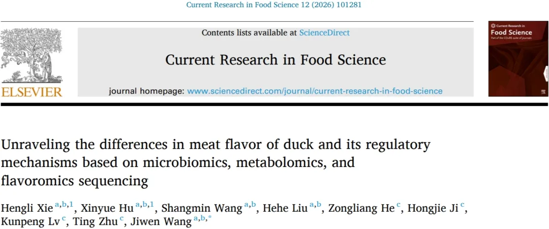 鸭是全球重要的商业家禽品种,具有极高的经济价值和营养价值,鸭肉富含必需氨基酸和多不饱和脂肪酸,兼具优良的营养品质和风味特性。肉风味是影响消费者购买决策的关键因素,主要由挥发性化合物和水溶性化合物共同决定,其中挥发性风味成分包括吡嗪类、醛类、酸类等低分子量有机化合物,水溶性化合物则涵盖游离氨基酸、风味核苷酸、有机酸等,共同构成酸、甜、苦、咸、鲜五种基本味觉。不同家禽品种间的风味差异显著,已有研究通过 SPME-GC-O-MS、LC-MS 等技术证实,不同鸡品种的 odor-active 化合物和水溶性化合物谱存在明显区别,而这些风味化合物均来源于糖、氨基酸、脂肪酸等前体物质,在肉类加工过程中通过脂质氧化、美拉德反应等转化生成,因此探究前体物质的代谢机制对改善鸭肉风味至关重要。肠道微生物和遗传因素是影响肉风味前体物质的关键因素,遗传背景会影响肠道微生物定植模式,而肠道微生物可通过调控脂肪酸、氨基酸代谢等影响宿主肌肉代谢,进而改变肉类风味,这一机制在猪肉中已得到证实,但肠道微生物调控鸭肉风味形成的具体分子机制仍不明确。樱桃谷鸭(CV)是优质肉鸭品种,具有体型大、产肉率高的特点;连城白鸭(LC)则以风味独特、肉质优良著称;金陵白鸭(JL)为 CV 与 LC 的杂交后代,遗传背景的差异可能通过影响肠道微生物群落,进而改变鸭肉中代谢物质的组成与含量,基于此,本研究提出核心假设:遗传背景差异通过调控肠道微生物,影响风味前体物质沉积,最终导致鸭肉风味差异,旨在通过电子鼻、SPME-GC-O-MS、LC-MS 及 16S rRNA 测序等多组学技术,阐明肠道微生物调控鸭肉风味的潜在机制,为鸭肉品质改良提供理论依据。