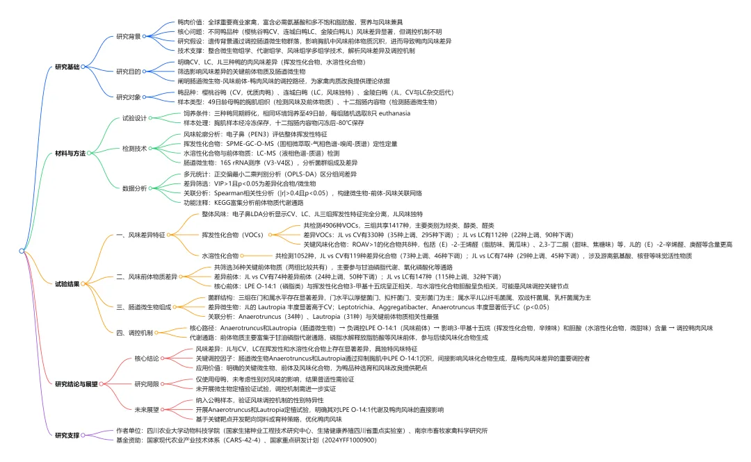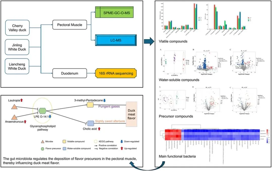 消费者对高品质鸭肉风味的需求日益增长,有报道显示不同鸭品种间存在显著风味差异。本研究旨在明确金陵白鸭(JL)、樱桃谷鸭(CV)和连城白鸭(LC)的风味差异及其调控机制。电子鼻检测结果表明,LC、CV 和 JL 的风味存在明显区别。分析显示,JL 与 CV 组间存在 330 种差异挥发性有机化合物(VOCs)和 119 种差异水溶性化合物,JL 与 LC 组间存在 112 种差异 VOCs 和 74 种差异水溶性化合物。胸肌代谢组学分析显示,JL 与 CV 组间有 74 种差异前体物质,JL 与 LC 组间有 147 种差异前体物质。多组学分析表明,厌氧截短菌属(Anaerotruncus)和劳特罗普氏菌属(Lautropia)可能负向调控胸肌中风味前体物质 LPE O-14:1 的沉积,进而影响 3 - 甲基十五烷和胆酸的含量,最终调控鸭肉风味。这些发现表明,与 LC 和 CV 相比,JL 具有独特的风味特征,为家禽产业的肉质改良提供了宝贵参考。研究背景