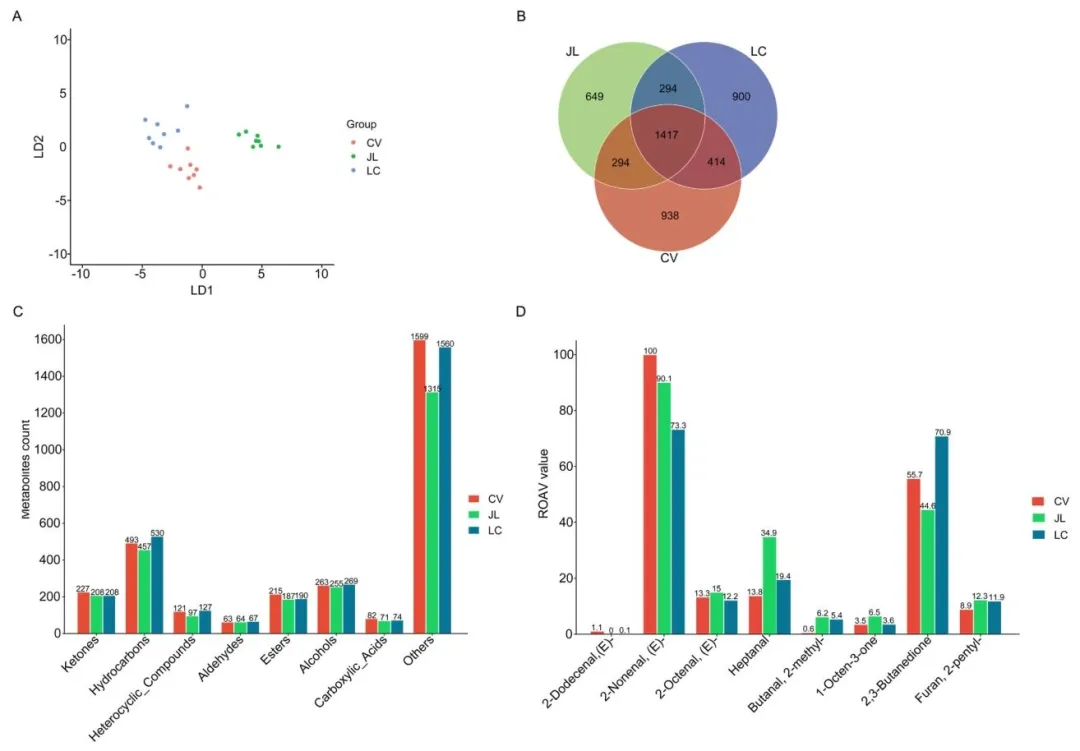 (A)电子鼻数据的线性判别函数;(B)CV、JL 和 LC 中挥发性化合物的维恩图;(C)CV、JL 和 LC 中挥发性化合物的类别分析;(D)CV、JL 和 LC 中挥发性化合物的相对气味活性值(ROAV)
