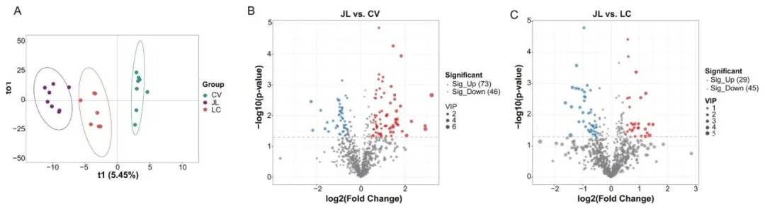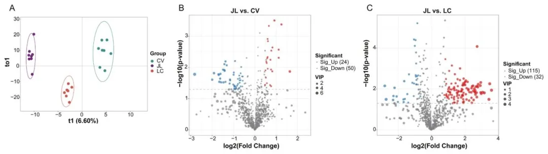 (A)CV、JL 和 LC 中前体化合物的 OPLS-DA 模型;(B)JL vs CV 组风味前体化合物的差异分析;(C)JL vs LC 组风味前体化合物的差异分析