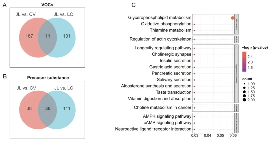 (A)挥发性有机化合物(VOCs)的维恩图;(B)关键前体代谢物的维恩图;(C)前体化合物的 KEGG 富集分析