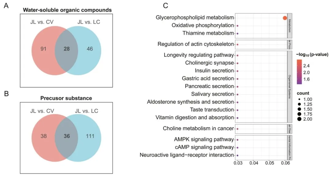 (A)CV、JL 和 LC 中味觉化合物的 OPLS-DA 模型;(B)JL vs CV 组水溶性化合物的差异分析;(C)JL vs LC 组水溶性化合物的差异分析