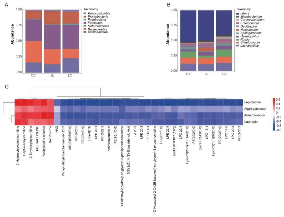 (A)门水平的细菌群落组成;(B)属水平的细菌群落组成;(C)微生物与关键前体代谢物的相关性分析