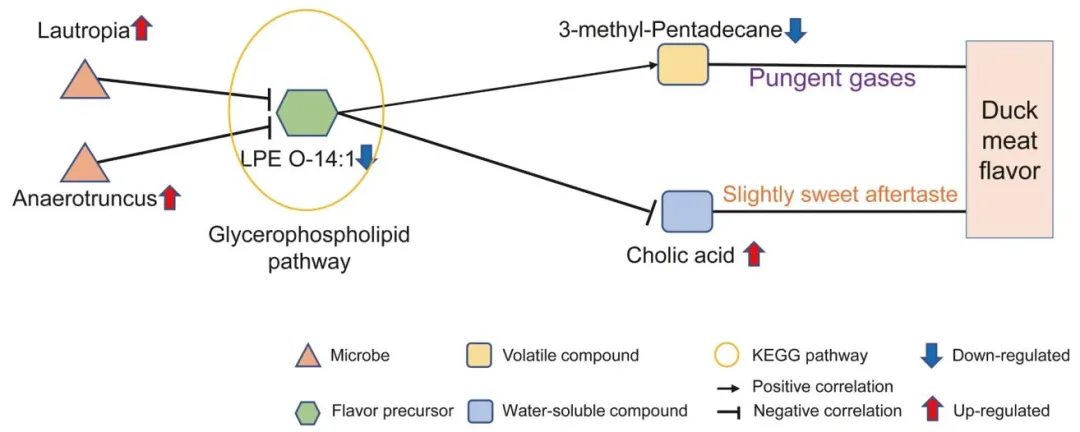 注:图中涉及关联关系:劳特罗普氏菌属(Lautropia)、厌氧截短菌属(Anaerotruncus)(微生物)→ 负调控 LPE O-14:1(风味前体)→ 影响 3 - 甲基十五烷(挥发性化合物,辛辣气体)和胆酸(水溶性化合物,微甜味)含量→ 调控鸭肉风味;涉及代谢通路:甘油磷脂代谢通路;箭头标注:正相关(Positive correlation)、负相关(Negative correlation)、上调(Up-regulated)、下调(Down-regulated)