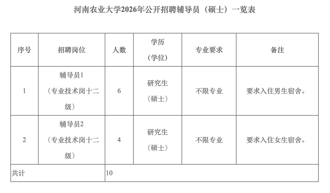 7.其他要求见《河南农业大学2026年公开招聘辅导员(硕士)一览表》。