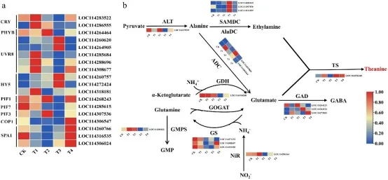 图1 不同光照处理下光信号基因(a)的表达水平以及与茶氨酸生物合成相关基因的表达模式(b)