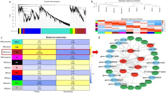 同时,通过加权基因共表达网络分析,选出KME(Module Membership)值最高的基因CsNHL和CsCML42(图2),推测是红蓝光对茶氨酸代谢进行调控的枢纽基因。本研究初步阐明了光质调控茶树中茶氨酸积累的生理和分子基础,为提高保靖黄金茶的经济价值提供了理论依据和技术参考。