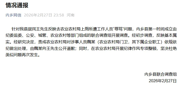 针对我县居民王先生反映去农业农村局上厕所遭工作人员“辱骂”问题,内乡县第一时间成立由纪委监委、公安、城管、农业农村等部门组成的联合调查组开展调查。经初步调查,反映基本属实。