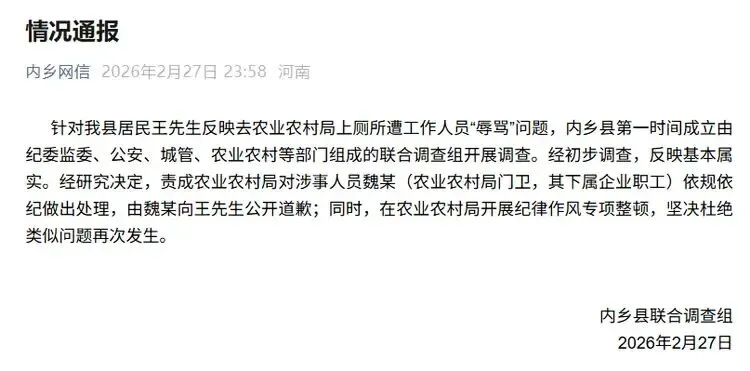 针对我县居民王先生反映去农业农村局上厕所遭工作人员“辱骂”问题,内乡县第一时间成立由纪委监委、公安、城管、农业农村等部门组成的联合调查组开展调查。经初步调查,反映基本属实。经研究决定,责成农业农村局对涉事人员魏某(农业农村局门卫,其下属企业职工)依规依纪做出处理,由魏某向王先生公开道歉;同时,在农业农村局开展纪律作风专项整顿,坚决杜绝类似问题再次发生。