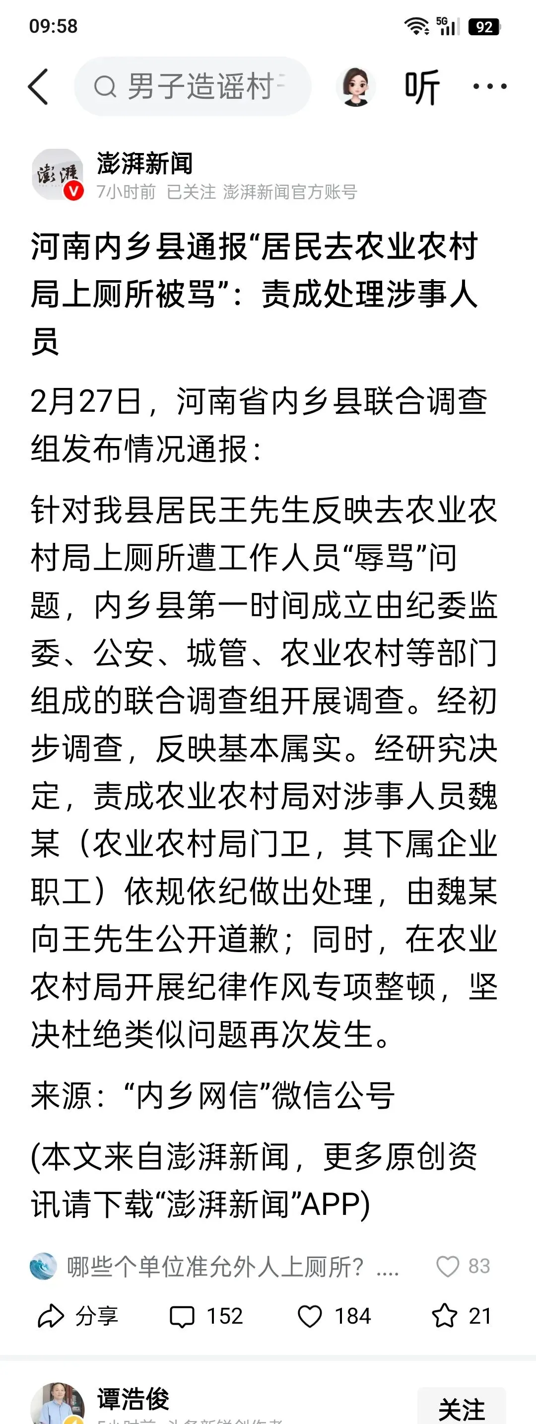 河南内乡县通报“居民去农业农村局上厕所被骂”:责成处理涉事人员