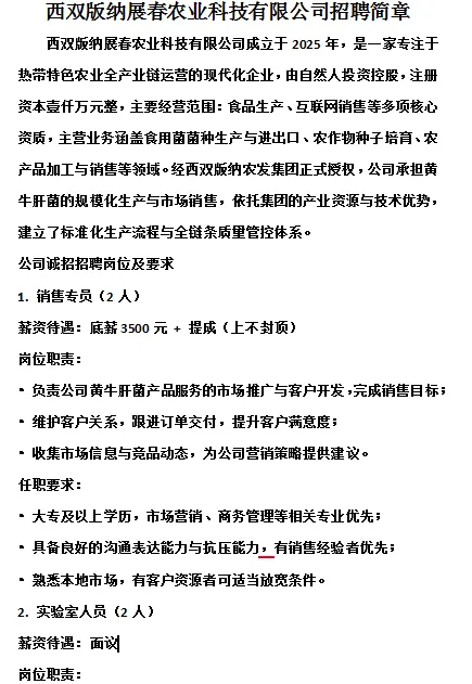 >3600元/月,西双版纳展春农业科技有限公司招聘(5人)公告!