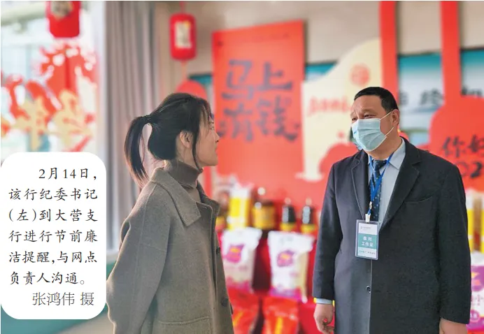 网点巡查。聚焦节日期间易发多发的违规收送礼品礼金、违规吃喝、公车私用、作风松散等问题,该行纪委采取“四不两直”方式,在春节前夕和节假日期间对全辖营业网点开展专项巡查。重点检查网点值班值守、服务规范、廉洁从业、风险防控及纪律作风情况,现场指出问题、督促立行立改,做到早提醒、早纠正、早防范,以严的基调压实基层廉洁责任。