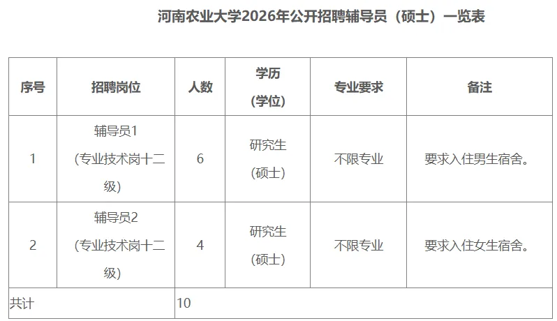 7.其他要求见附件2《河南农业大学2026年公开招聘辅导员(硕士)一览表》。