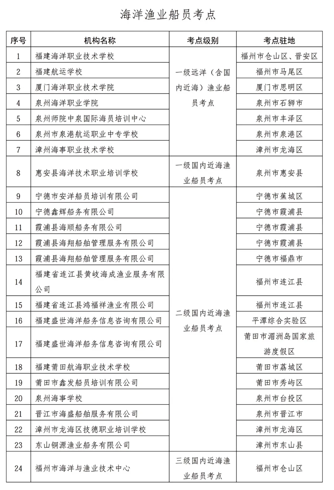 按照海洋渔业船员考点管理有关规定,现将符合条件的海洋渔业船员考点予以公布,欢迎社会及群众对考点进行监督,为提高渔业船员培训考试质量创造更好条件。