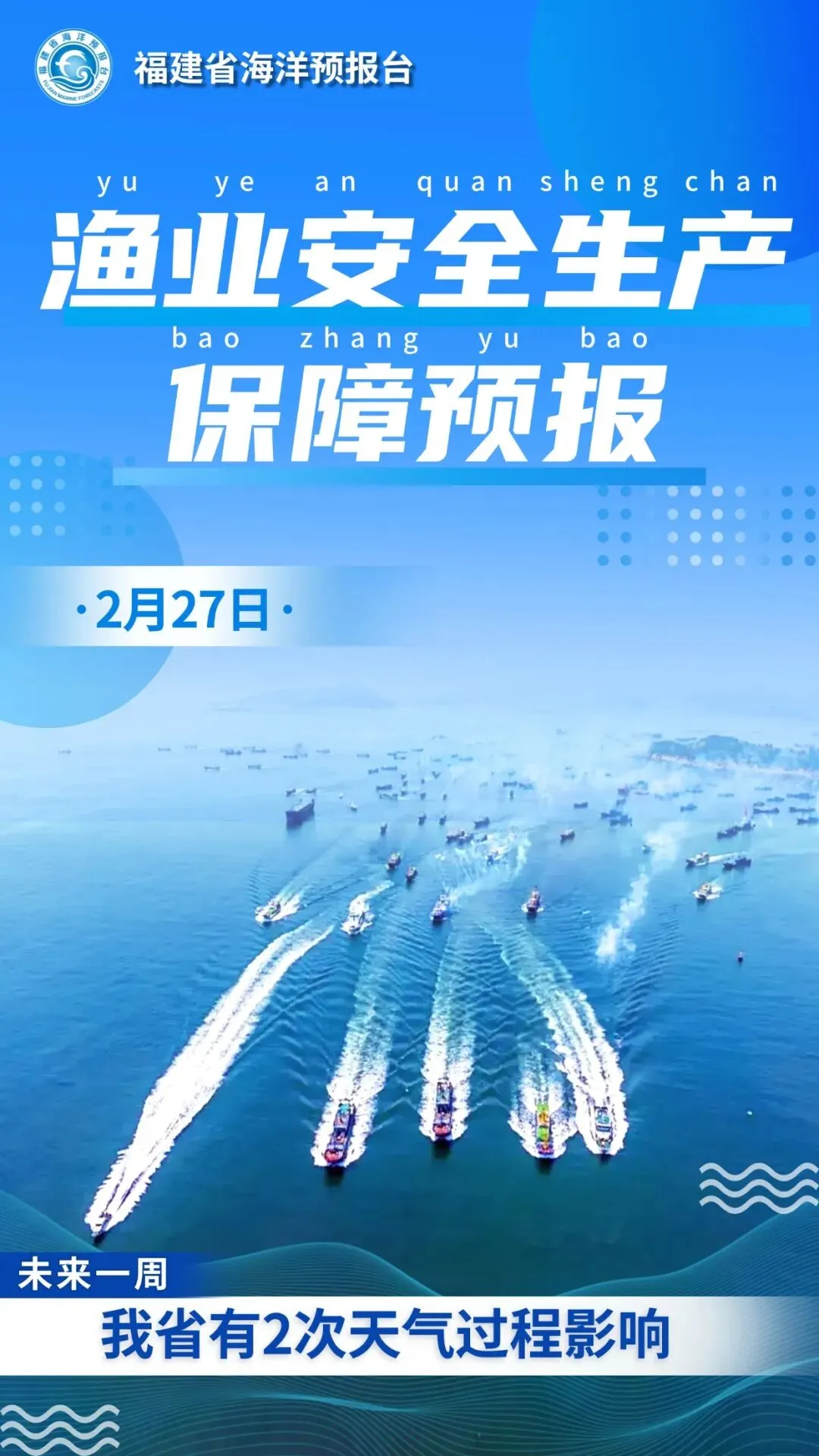 未来一周有2次天气过程影响我省海域。2月27-28日,受冷空气影响,台湾海峡风浪较大;3月3-5日,受冷空气影响,台湾海峡风浪较大。