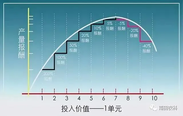 在一定条件下,向一定面积土地中投施数量较少的肥料时,平均每单位投入(如1元投资或1千克肥)带来的报酬(产品增加量或收益增加量)较高,随着施肥量的增加,报酬量也增加,但平均每单位的投入带来的报酬会逐步降低,而如果施肥过量,还会导致减产。可见,施肥量是有限度的,只有合理的施肥量(也称最佳施肥量),才能取得较高的施肥效益。