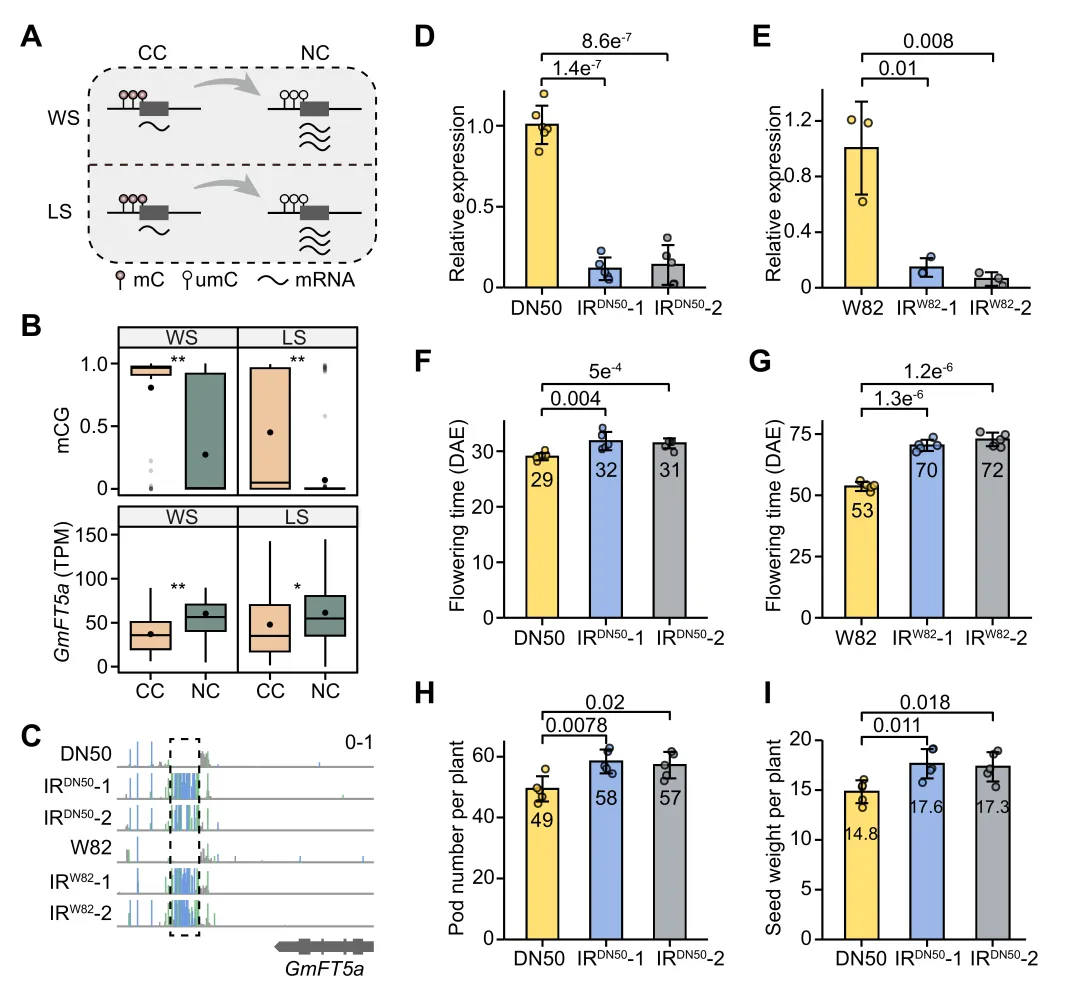 野生大豆与栽培大豆均经历了向高纬度地区扩张的过程,即向北自然扩散和人工引种。大豆在两个过程中均表现出对长日照环境的适应性演化,最显著的特征即为开花期的提前。通过群体分析发现,表观遗传变异在趋同进化中发挥了关键作用,并鉴定了一个位于关键开花基因GmFT5a下游1.6 kb的表观变异位点(图2A-C)。该位点在野生大豆和栽培大豆向北扩散中均呈现DNA甲基化降低,GmFT5a表达水平升高的趋势,并且没呈现明显的遗传变异。利用靶向DNA甲基化编辑技术证实,改变该位点的甲基化水平可以影响GmFT5a的表达,从而影响开花期和单株产量(图2C-I),明确了该表观遗传位点在野生大豆和栽培大豆趋同进化中的重要作用。