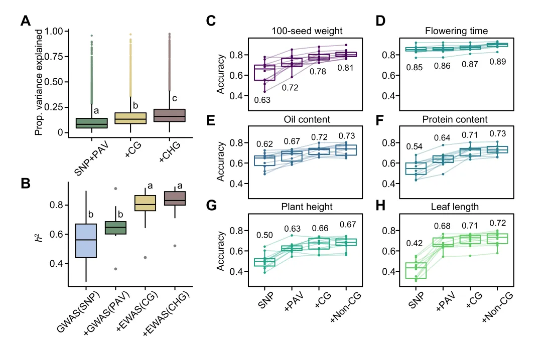 在复杂性状的研究中,通过全基因组关联分析(GWAS)等方法已鉴定出的遗传变异,无法完全解释该性状在群体中观测到的总遗传力,这一现象往往被称为“丢失的遗传力”。表观遗传变异是否在“丢失的遗传力”中发挥重要作用尚无定论,该研究发现将表观遗传变异纳入分析模型,能显著提高基因表达的变异解释率,并鉴定出一批与重要农艺性状显著相关的表观遗传变异位点(图3A, B)。整合遗传与表观遗传信息,能够更准确地预测大豆的农艺性状,明确了表观遗传对于农艺性状决定的重要作用,为未来智能设计育种提供了全新的数据维度(图3C-H)。
