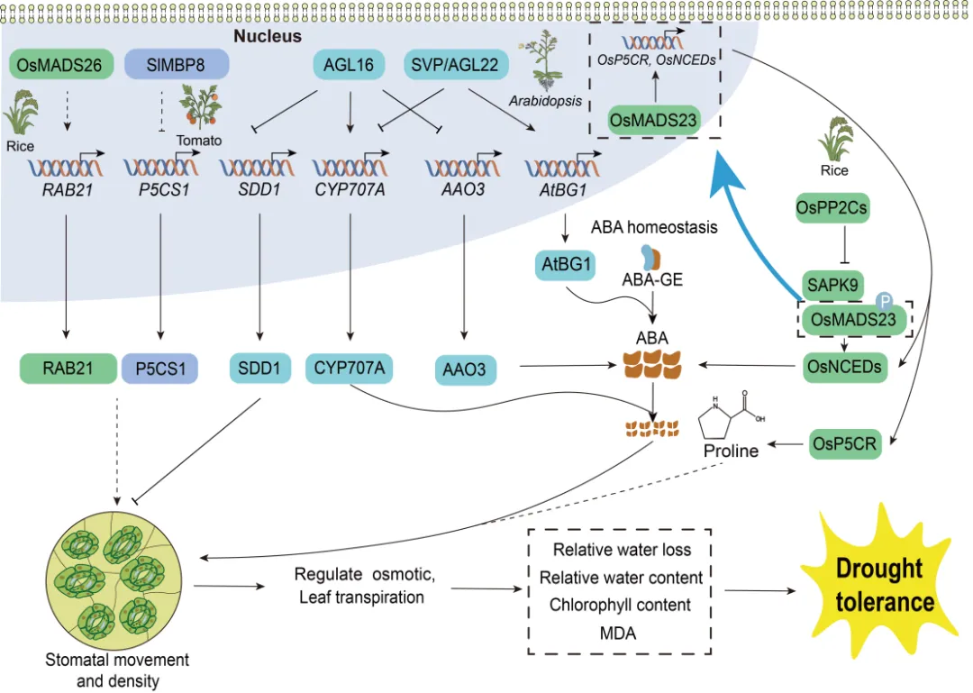 (1)应对干旱胁迫:MADS-box蛋白主要通过调控气孔动态和脱落酸(ABA)信号通路来响应干旱。例如,在拟南芥中,AGL16负向调控干旱耐受性,它抑制气孔发育基因SDD1和ABA合成关键基因AAO3的表达。相反,SVP蛋白则通过上调AtBG1基因来促进ABA的积累,增强气孔关闭。在水稻中,OsMADS23作为正调控因子,其磷酸化激活后能促进ABA和脯氨酸的合成,显著提升抗旱性;而其旁系同源基因OsMADS26则扮演负调控角色(图1)。