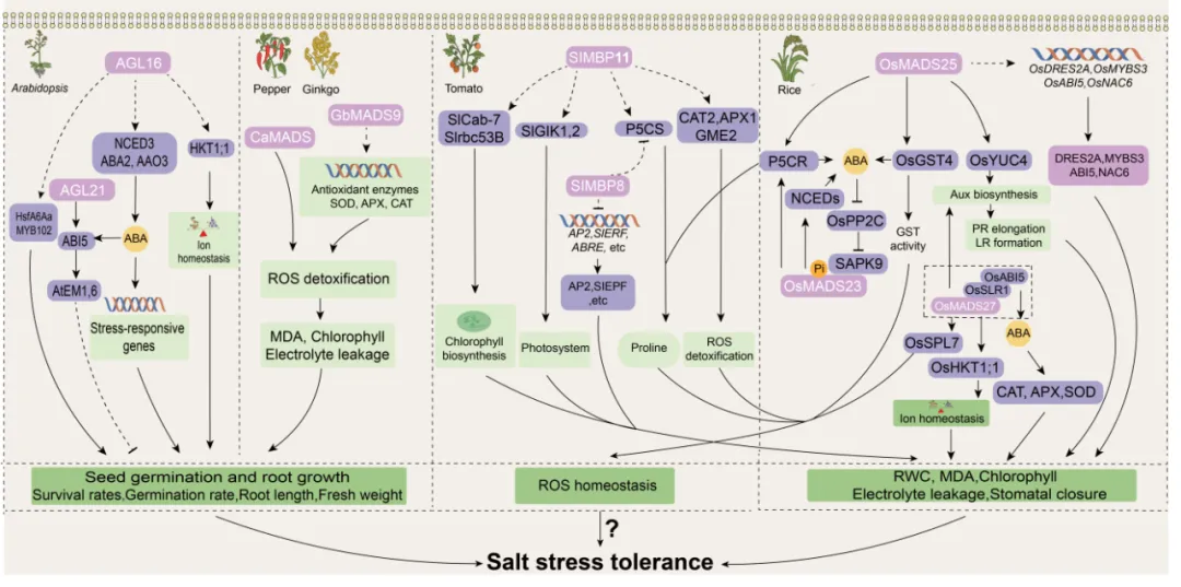 图2 不同植物物种中多种MADS-box转录因子增强耐盐性的调控功能