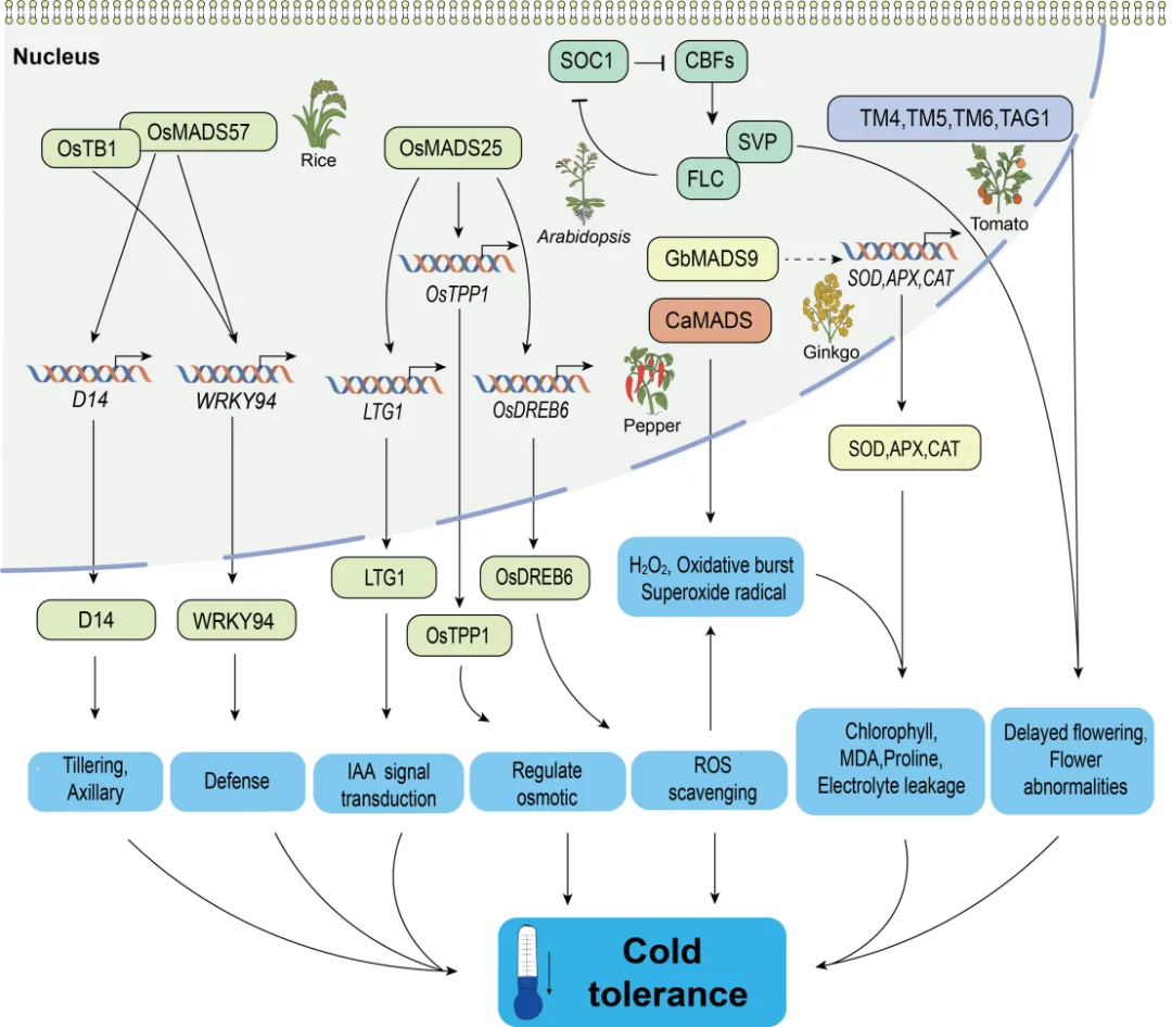 (3)适应温度变化:MADS-box因子是植物感知温度波动的“核心调节枢纽”。高温胁迫下,水稻OsMADS87调控胚乳发育和种子大小,影响热敏感性;拟南芥AGL67参与种子萌发的热抑制过程。低温胁迫下,水稻OsMADS25通过增强ROS清除能力来提高耐冷性,而OsMADS57则通过与OsTB1互作,协调分蘖发育与冷胁迫响应。拟南芥中的开花抑制因子FLC和整合因子SOC1则共同构成了协调开花时间与越冬抗寒能力的关键模块(图3)。