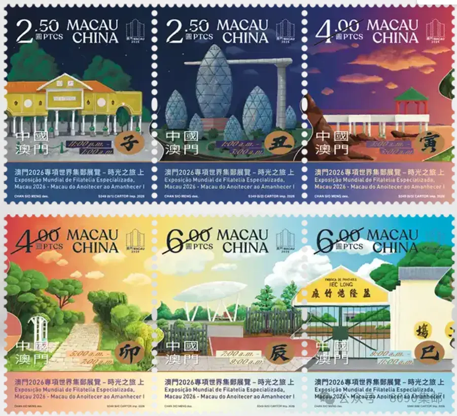 本套邮票由陈绍明设计,邮票规格为30x40mm,由法国 Cartor Security Printers采用胶版印制。此套邮票将与2026年6月27日发行的“澳门2026专项世界集邮展览 - 时光之旅(下)”合辑成一张特别版式小版张,并以礼盒形式销售,每套售价为澳门元一百元。