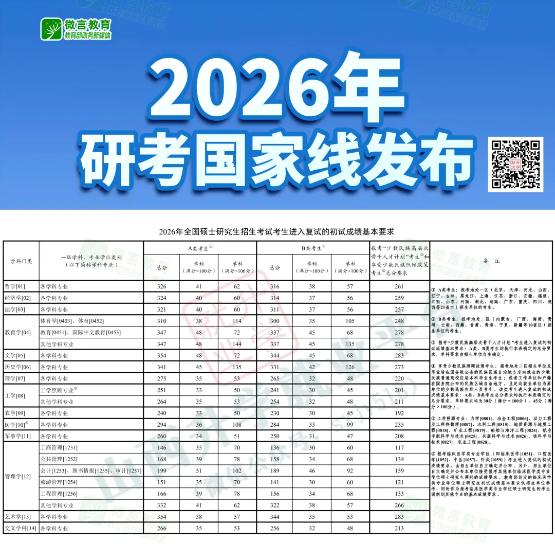 2026年研考国家线已公布,初步总结如下:
