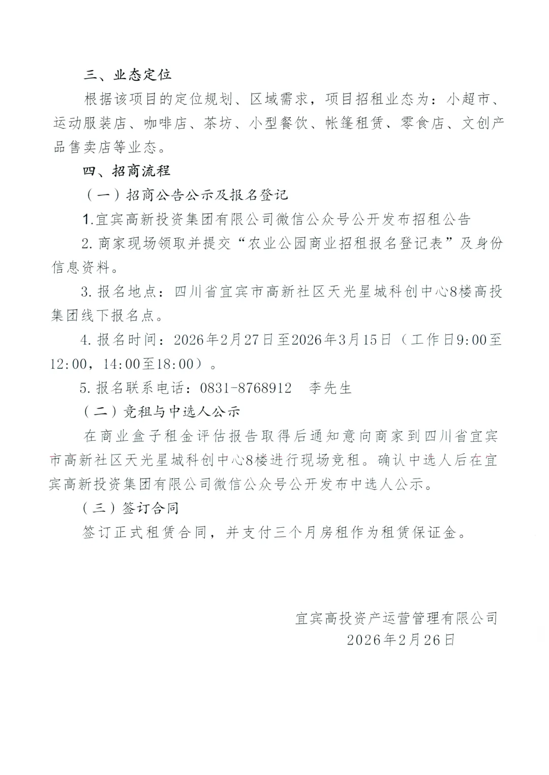 >2026年宜宾高新区农业公园商业盒子招商公告