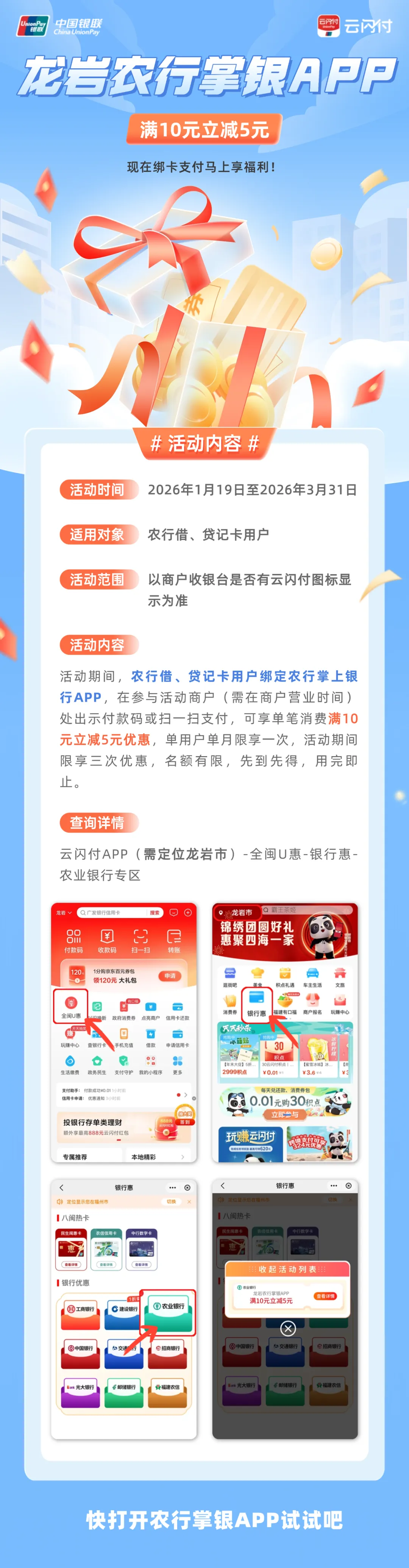 >龙岩农行送福利:掌银APP支付满10减5,名额有限速领!