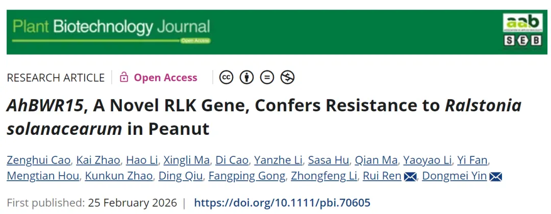 2026年2月25日,河南农业大学农学院殷冬梅教授团队在Plant Biotechnology Journal上发表了题为“AhBWR15, A Novel RLK Gene, Confers Resistance to Ralstonia solanacearum in Peanut”的研究成果,该研究在Chr15染色体精细定位到抗青枯病的关键基因AhBWR15,该基因能够通过激活脱落酸(ABA)信号通路来显著增强对青枯病的抗性,为培育抗青枯病花生品种提供了宝贵的遗传资源。