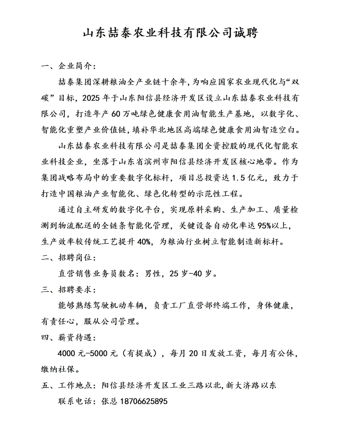 山东喆泰农业科技有限公司诚聘