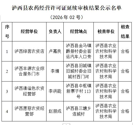 根据《农药管理条例》、《农药经营许可证管理办法》和《云南省农药经营许可实施办法》等规定,下列农药经营许可申请者通过我局农药经营许可审核小组材料审查和实地核查,符合农药经营许可证(限制使用农药除外)延续条件,现予以公示。公示期7个工作日,时间:2026年2月27日至2026年3月6日。