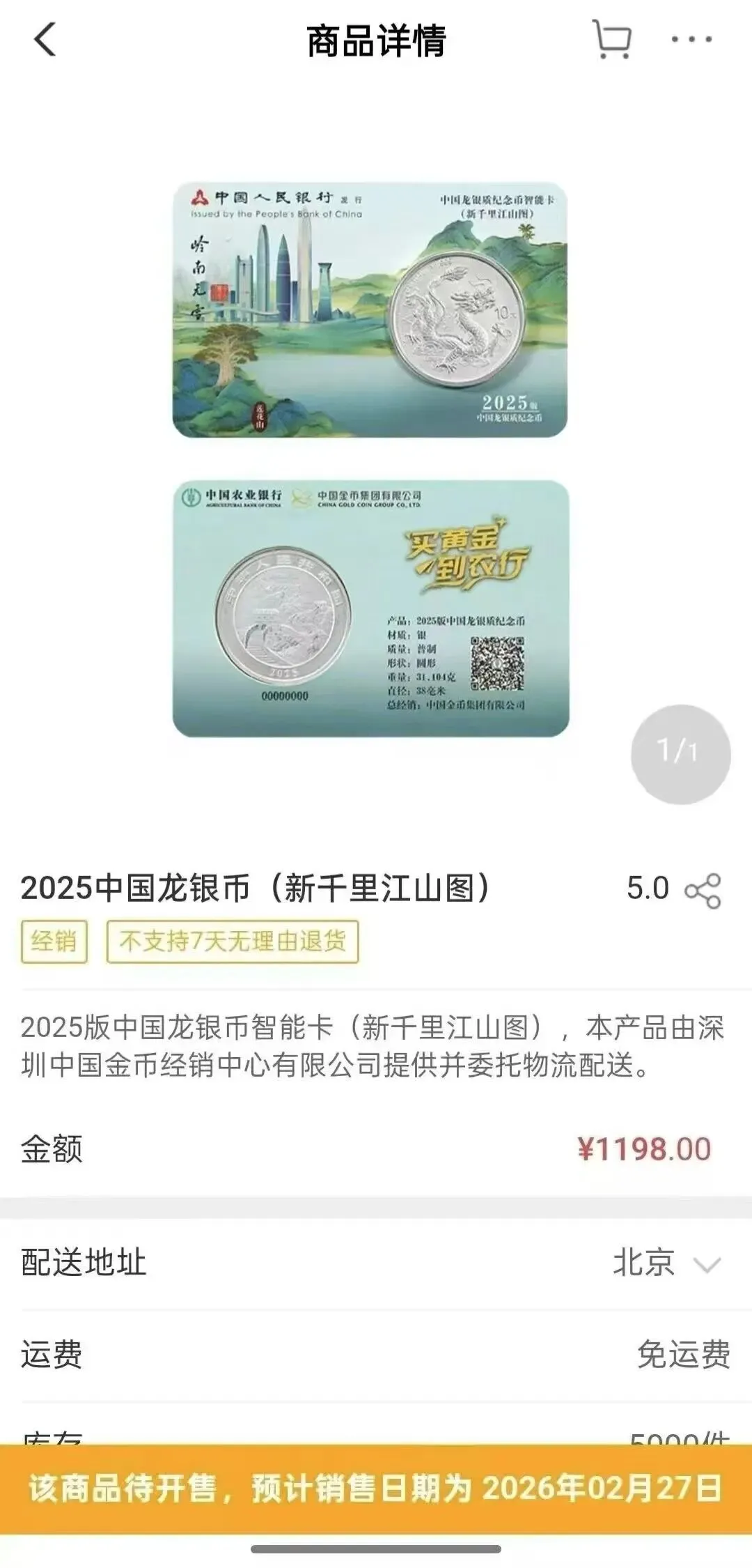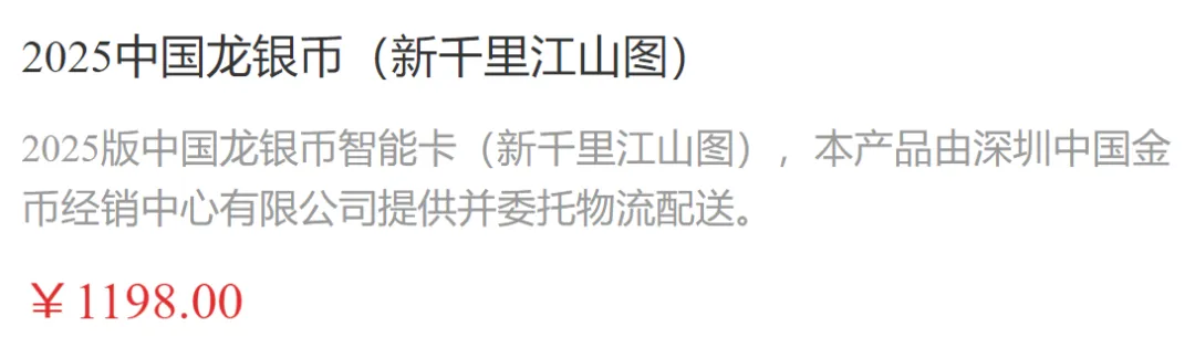 正式开启预售!但因为限购5枚,15000枚的话,线上1000人,线下2000人。预约难度还是挺高的。这次销售主要没有官方公告,同时每个人购买量相对比较多,因此幸运的藏友并不多。新千里江山图卡币线上5000枚,线下15000枚。每人均可预约5枚!每枚售价为1198元!有藏友给提供的截图而各大银行,都是由中国金币经销中心销售的,2025版中国龙纪念币境内发售的全部是各种封装的规格,预计也等不来裸币销售了。2026版中国龙币3月预约