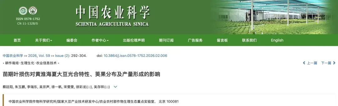 蔡廷阳, 朱玉鹏, 李瑞东, 吴宗声, 徐一帆, 宋雯雯, 徐彩龙, 吴存祥. 苗期叶损伤对黄淮海夏大豆光合特性、荚果分布及产量形成的影响[J]. 中国农业科学, 2026, 59(2): 292-304.