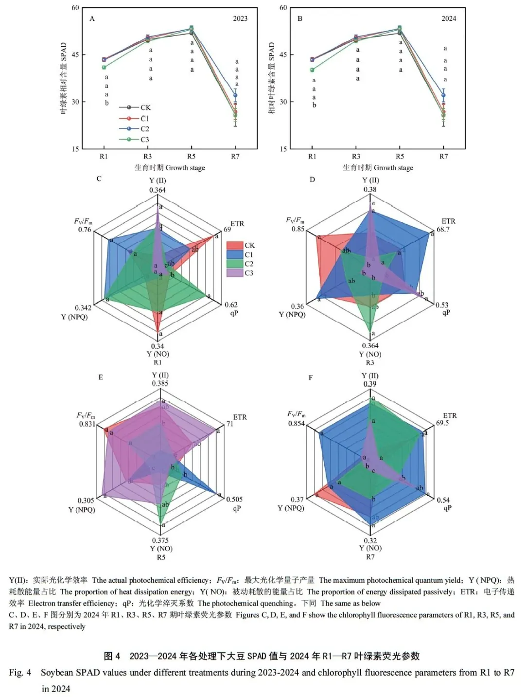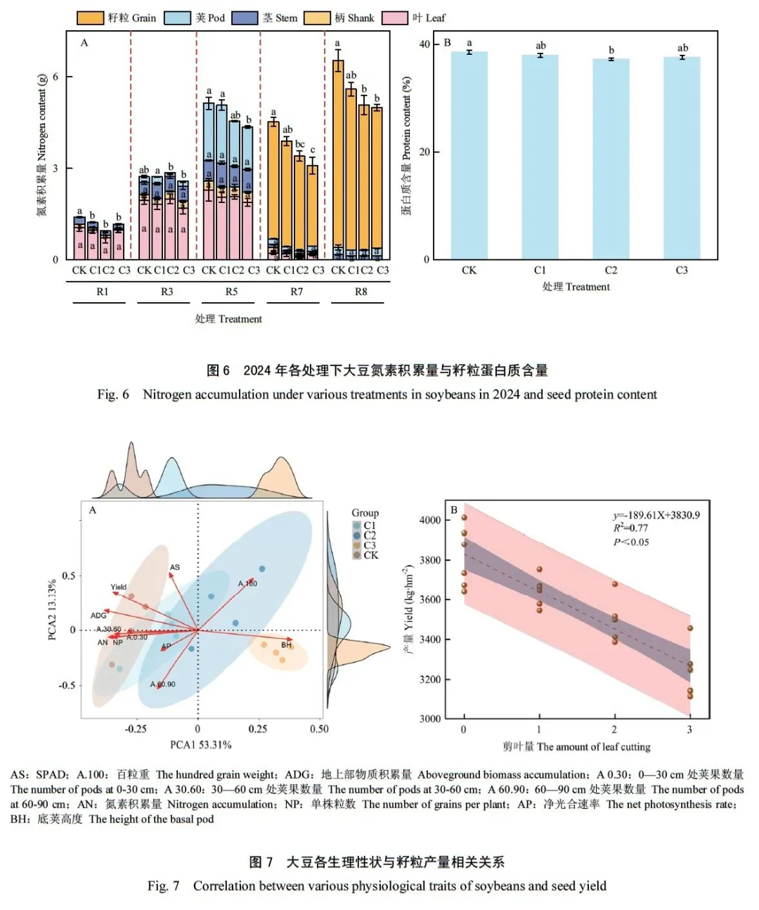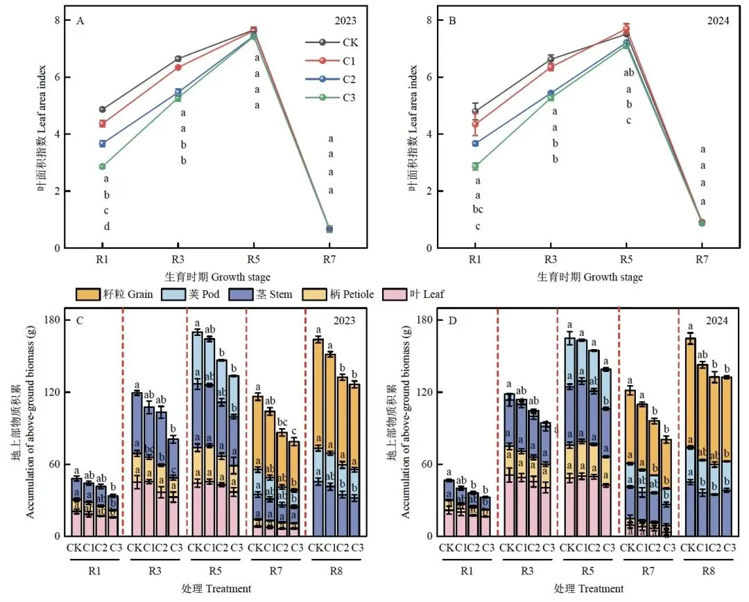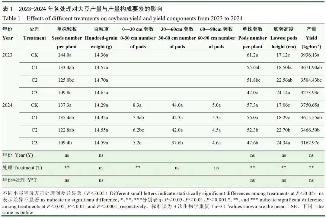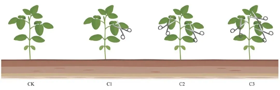 该研究以中黄301为试验材料,通过2年田间试验于大豆V3期设置不同剪叶处理:CK(不剪叶)、C1(剪去1片三出复叶)、C2(剪去2片三出复叶)、C3(剪去3片三出复叶),模仿大豆幼苗因恶劣天气造成的叶面积下降现象,系统解析苗期去叶对大豆产量及生理特性的影响。