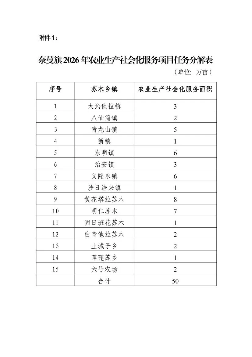 附件:1.奈曼旗2026年农业生产社会化服务项目任务分配表